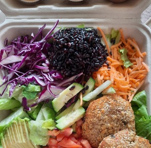 Black Japonica rice (high in protein, fiber, and antioxidants; low in fat) avocado, lettuce, carrot, tomato, cucumber, and green onion with your choice of dressing